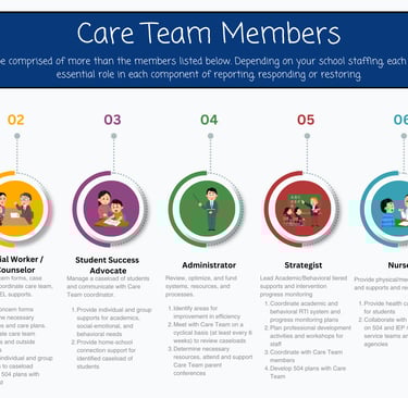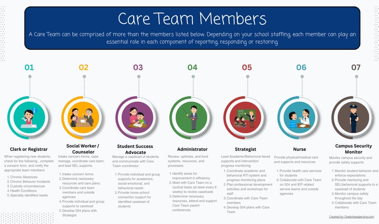 At the heart of the Report, Respond, Restore process is the Care Team, a dynamic group of school staff who bring their unique expertise to address students’ needs holistically. Key roles include: